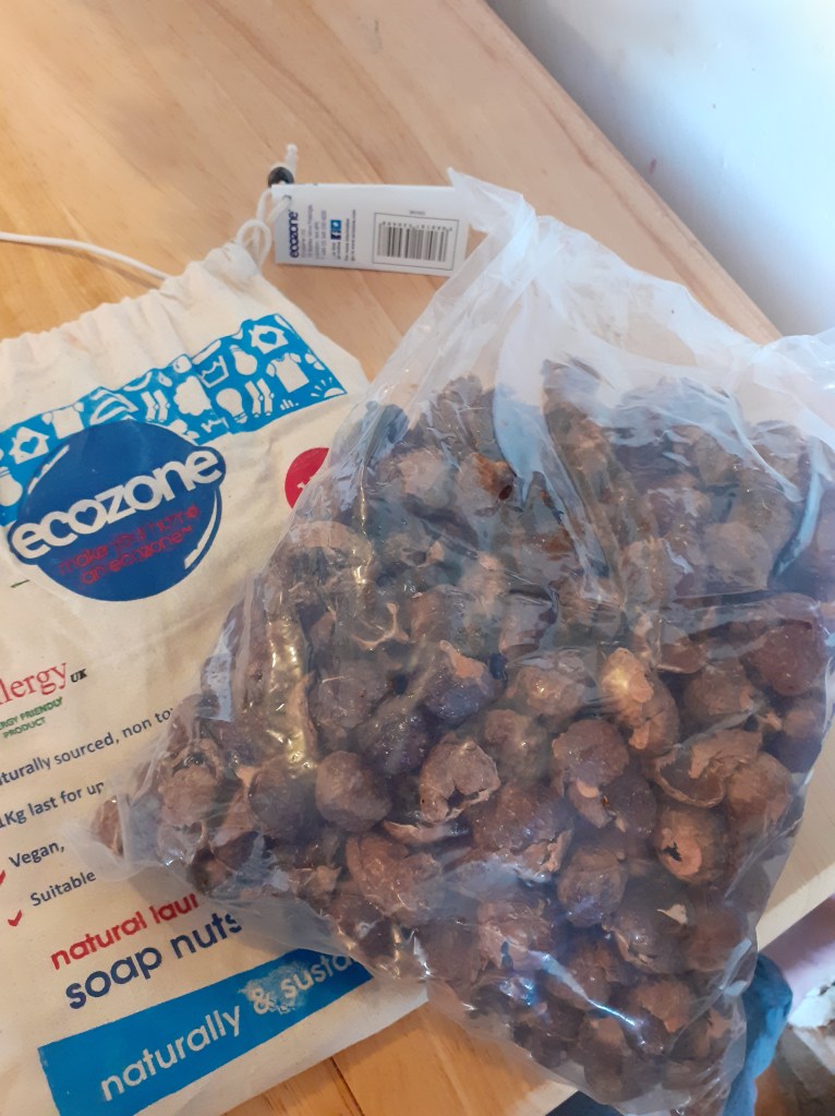 So, the soap nuts I bought were from ecozone. They came packaged in a plastic bag inside a branded cotton bag. This outraged me at first because their marketing definitely gives the impression there’s no plastic in the packaging, however the totally abhorrent smell of the nuts makes one quite thankful for the plastic in the end. Even if it’s not a recyclable plastic bag. The obvious damage of the nuts are the carbon footprint of them being flown over here. Sadly, ecozone don’t list where they source their soap nuts from (it was hard enough to figure out what actual nut they were selling), so I have no idea where the ones I bought were grown, whether they were farmed sustainably or the impact they have on the local populace. They are certified organic, although I’m not sure who by.